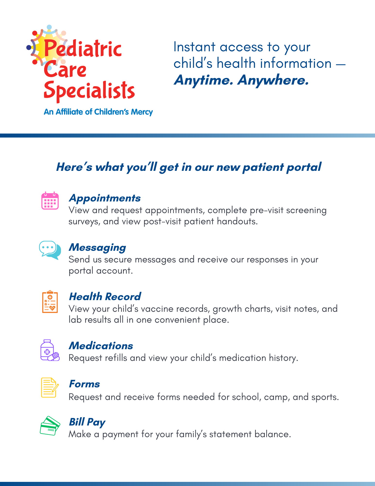 is excited to announce the upcoming launch of our new patient portal, designed to make managing your child's healthcare even easier. With the new portal, you'll be able to request appointments, communicate securely with our team, and access your child's health information, all in one convenient place. If you’re already enrolled in our current Patient Portal, be on the lookout in the next couple of weeks for an email with instructions on how to register for the new one. If you experience any difficulty in registering, please don't hesitate to call our friendly staff for assistance.